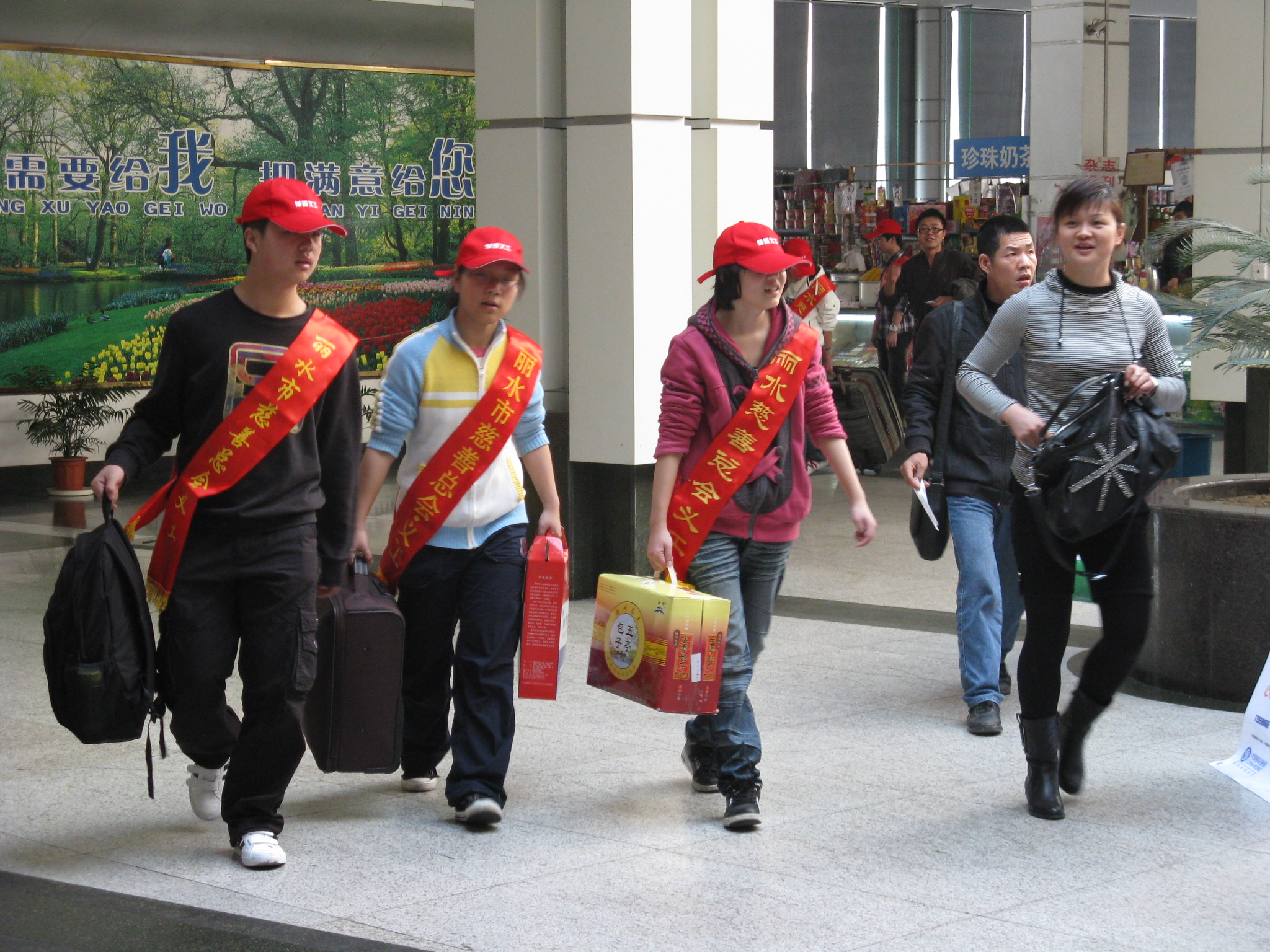 這些“小紅帽”來(lái)自麗水市慈善總會(huì),他們當(dāng)中有義工,有受慈善總會(huì)捐助的學(xué)生,一共20余人。一個(gè)個(gè)都頭戴小紅帽,身披市慈善總會(huì)的授帶。特意來(lái)到客運(yùn)東、西站,為南來(lái)北往的旅客送上熱情的幫助。他們的到來(lái),得到旅客的贊許。