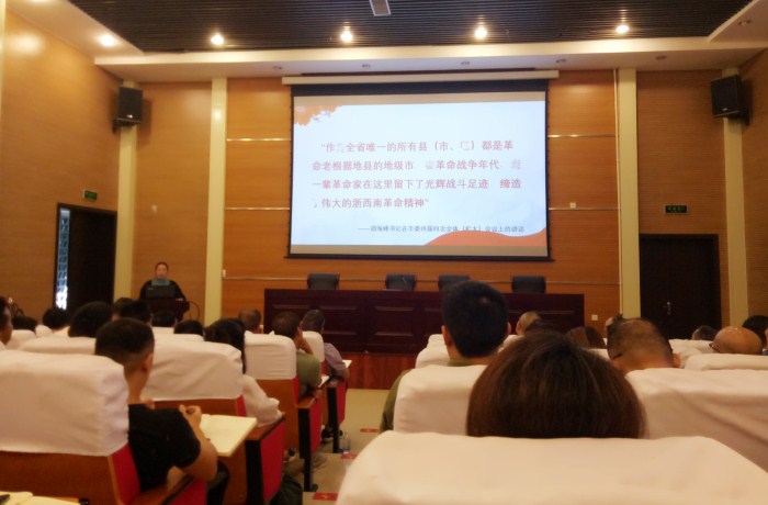 市委黨史研究室、市地方志辦公室主任雷華英從浙西南革命精神的歷史概況、內(nèi)涵和解讀、弘揚踐行浙西南革命精神三個方面授課。在革命戰(zhàn)爭年代,老一輩革命家在麗水所有的縣市區(qū)都留下了光輝戰(zhàn)斗足跡,締造了偉大的“浙西南革命精神”。周恩來同志在麗水的抗戰(zhàn)史;粟裕、劉英同志帶領(lǐng)中國工農(nóng)紅軍挺進(jìn)師,與麗水人民一道浴血奮戰(zhàn),團(tuán)結(jié)一心干革命,播撒了開啟光明的寶貴革命火種。直至如今,偉大精神已深深融入麗水大地,流淌在處州兒女的血脈中,成為激勵一代又一代麗水人堅定理想信念、戰(zhàn)勝一切困難、奪取前進(jìn)道路上一個又一個勝利的力量源泉。