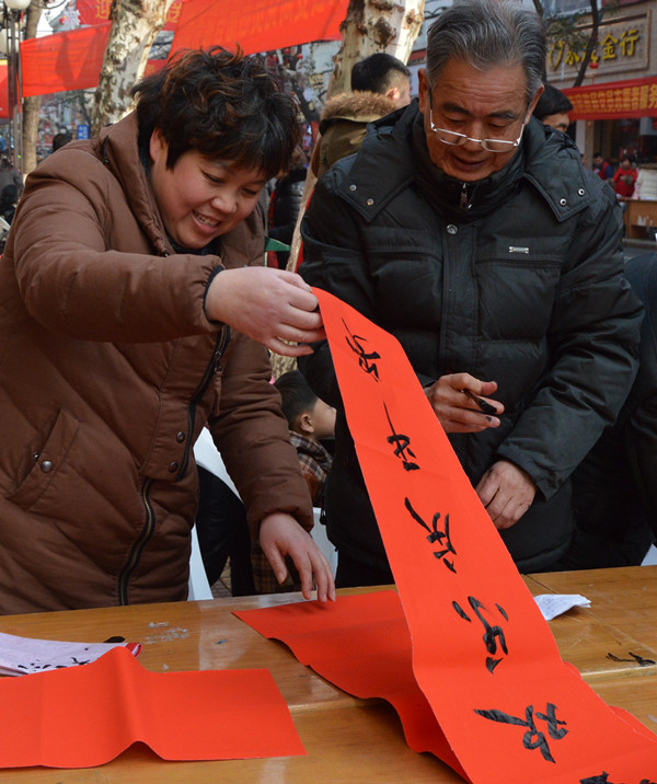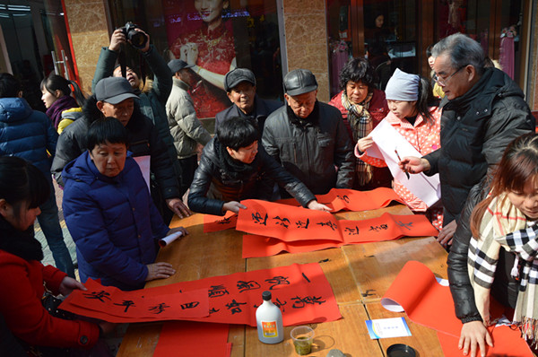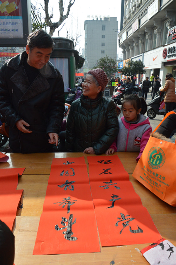 幾張小桌子拼成的簡(jiǎn)易書案更是黨員一條街上靚麗的風(fēng)景。三位老同志一落筆,書案旁邊一下子就圍滿了人,大家一邊排隊(duì)等候著“墨寶”,一邊點(diǎn)贊著三位老師的書法。葉女士高興地說:“手寫的春聯(lián)不僅更有年味,而且還是在弘揚(yáng)中國(guó)的書法藝術(shù)。中國(guó)傳統(tǒng)的年俗文化,現(xiàn)在已經(jīng)越來越難得了。”一對(duì)雙胞胎寶寶的父母恰巧推著嬰兒車從服務(wù)點(diǎn)前經(jīng)過,趕緊請(qǐng)老師寫下“開心寶貝”四個(gè)字,還說是給孩子倆最珍貴的新年禮物。